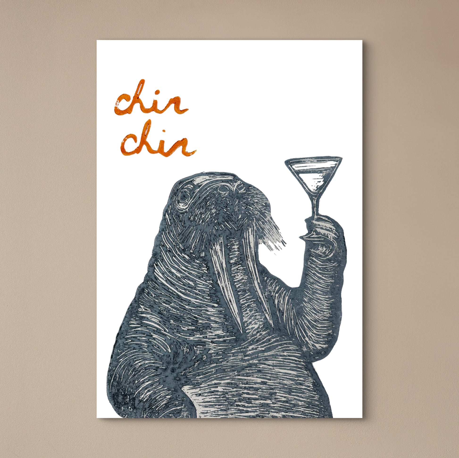 Classy, sassy, and a little bit cheeky, this hand-printed lino artwork celebrates the suave charm of a walrus enjoying a martini. Whether you're a cocktail lover or just adore quirky, handcrafted art, this print is bound to make a splash. For an extra playful touch, choose the option to include ‘Chin Chin’ – perfect for adding a toast-worthy vibe to your space! Each A4 print is carved and printed by hand on high-quality white card, ensuring every piece is one of a kind.